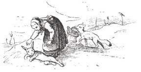 Der Hase that nach des Fuchsen Rath, fiel hin und stellte sich todt, und der Fuchs duckte sich hinter eine Windwehe von Schnee. Das Mädchen kam, sah den frischen Hasen, der alle Viere von sich streckte, stellte richtig ihren Korb hin und bückte sich nach dem Hasen.