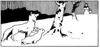 De haas volgde de raad van de vos op, viel neer en deed alsof hij dood was. En de vos verstopte zich achter een heuvel van opgewaaide sneeuw. Het meisje kwam, zag de verse haas, met de vier uitgestrekte poten, zette keurig haar mand neer en boog zich over de haas.
