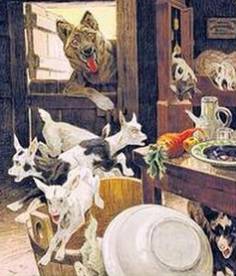 Het duurde niet lang of er klopte iemand aan de voordeur die riep: “Doe open, lieve kinderen, ik ben het, moeder, ik heb voor jullie allemaal iets meegebracht.” Maar de geitjes hoorden aan de rauwe stem dat het de wolf was. “Wij doen niet open,” riepen zij, “jij bent onze moeder niet, die heeft een zachte liefelijke stem, maar jouw stem is rauw; jij bent de wolf!”
