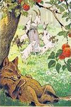 Toen liep de wolf naar een bakker en zei: “Ik heb mijn poot gestoten, smeer er eens wat deeg op.” En toen de bakker zijn poot met deeg had bestreken liep hij naar de molenaar en zei: “Strooi wat wit meel op mijn poot.” De molenaar dacht: "De wolf wil iemand bedriegen," en hij weigerde, maar de wolf zei: “Als je het niet doet, dan verslind ik je.” Daarop werd de molenaar bang en maakte de poot wit. Ja, zo zijn de mensen.