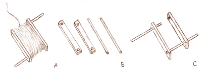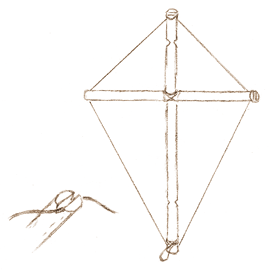 - Knoop sterk, dun bindtouw (lengte ongeveer 2,50 meter) aan de onderste gleuf van de lange stok. Vorm nu het geraamte door de draad rondom, door alle inkepingen van de uiteinden te leiden, te beginnen bij de onderste. Zie tekening 2.
